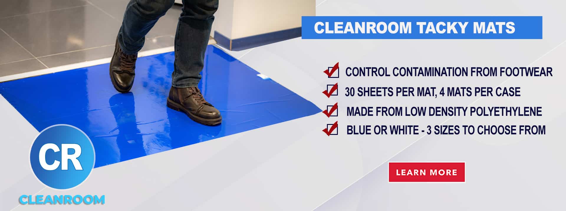 Cleanroom tacky mats help trap impurities for locations that require stringent dust and dirt control. Our cleanroom tacky mats are an economic solution that removes dirt and dust from shoe surfaces before they can contaminate your controlled environment.